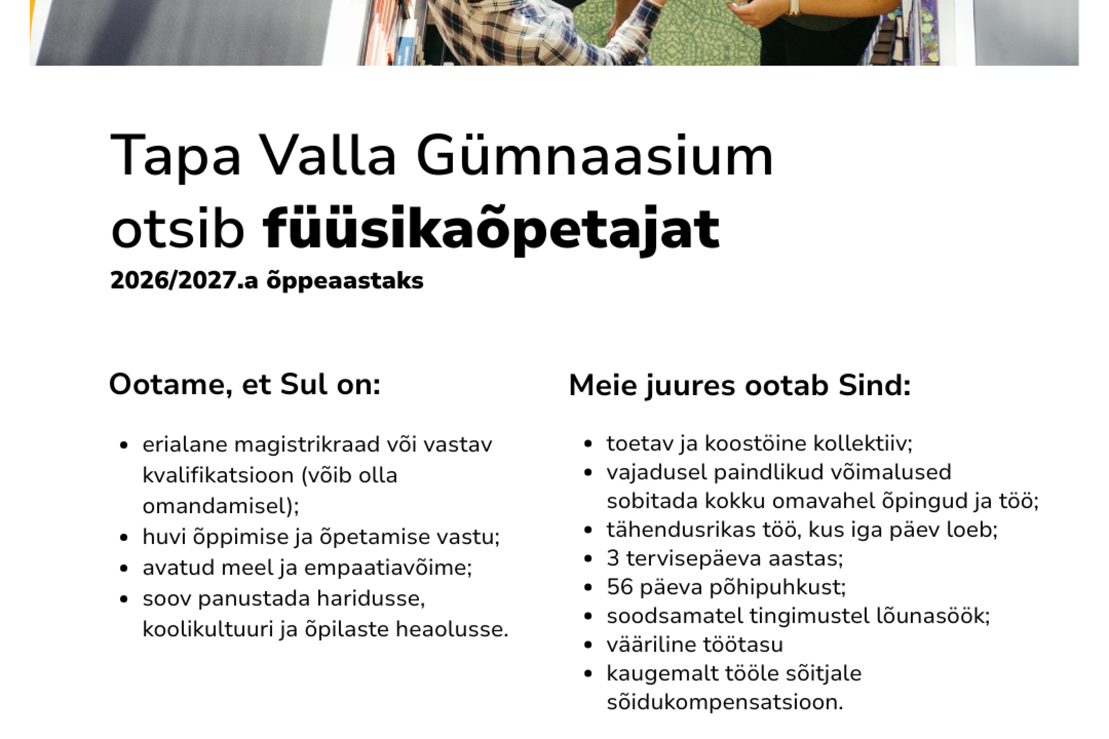 Tapa Valla Gümnaasium otsib füüsikaõpetajat2026/2027.a õppeaastaks Ava foto Avaldatud 13.02.2026. Viimati muudetud 13.02.2026.