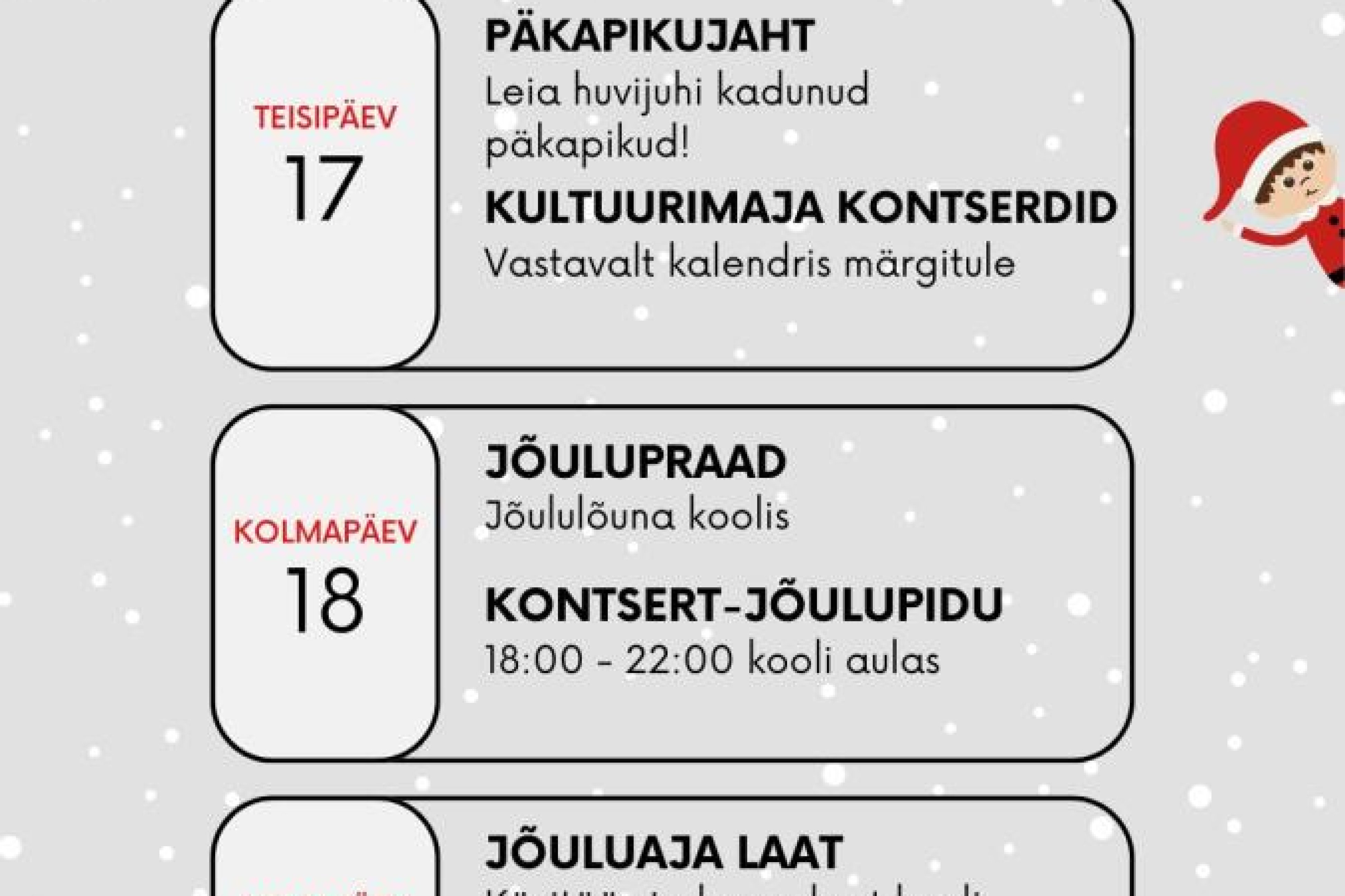 Päkapikud on kadunud! Õpilastel on võimalus osaleda päkapikujahis ja aidata huvijuhil nad üles leida. Lisaks toimuvad kultuurimaja kontserdid, vastavalt kalendris märgitud aegadele. - Kolmapäev, 18. detsember: