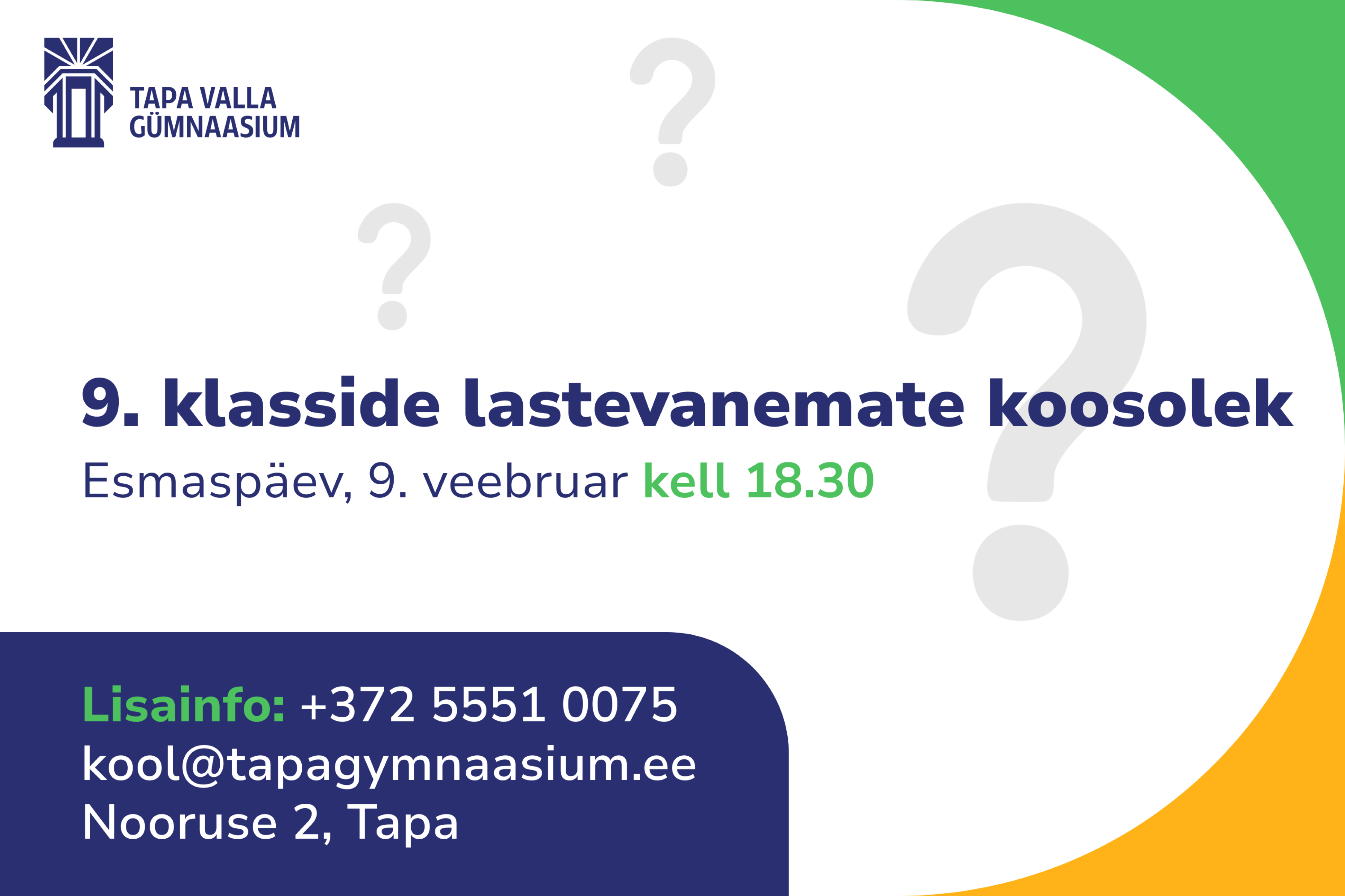 Tapa Valla Gümnaasium kutsub 9. klasside lapsevanemaid koosolekule esmaspäeval, 9. veebruaril kell 18.30.