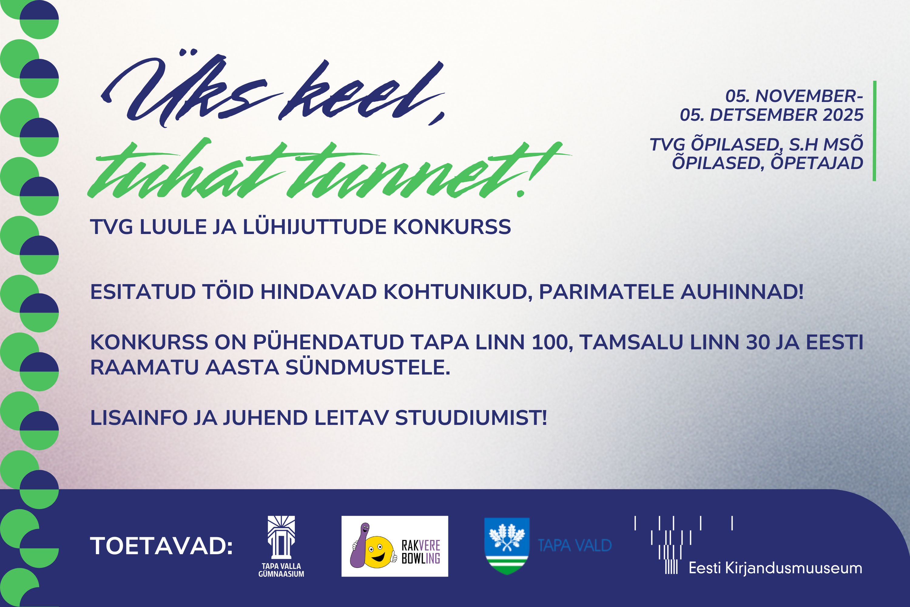 Kuni 5. detsembrini 2025 ootame kõikidelt TVG õpilastelt ning õpetajatelt omaloomingut luuletuste ning lühijuttude näol!