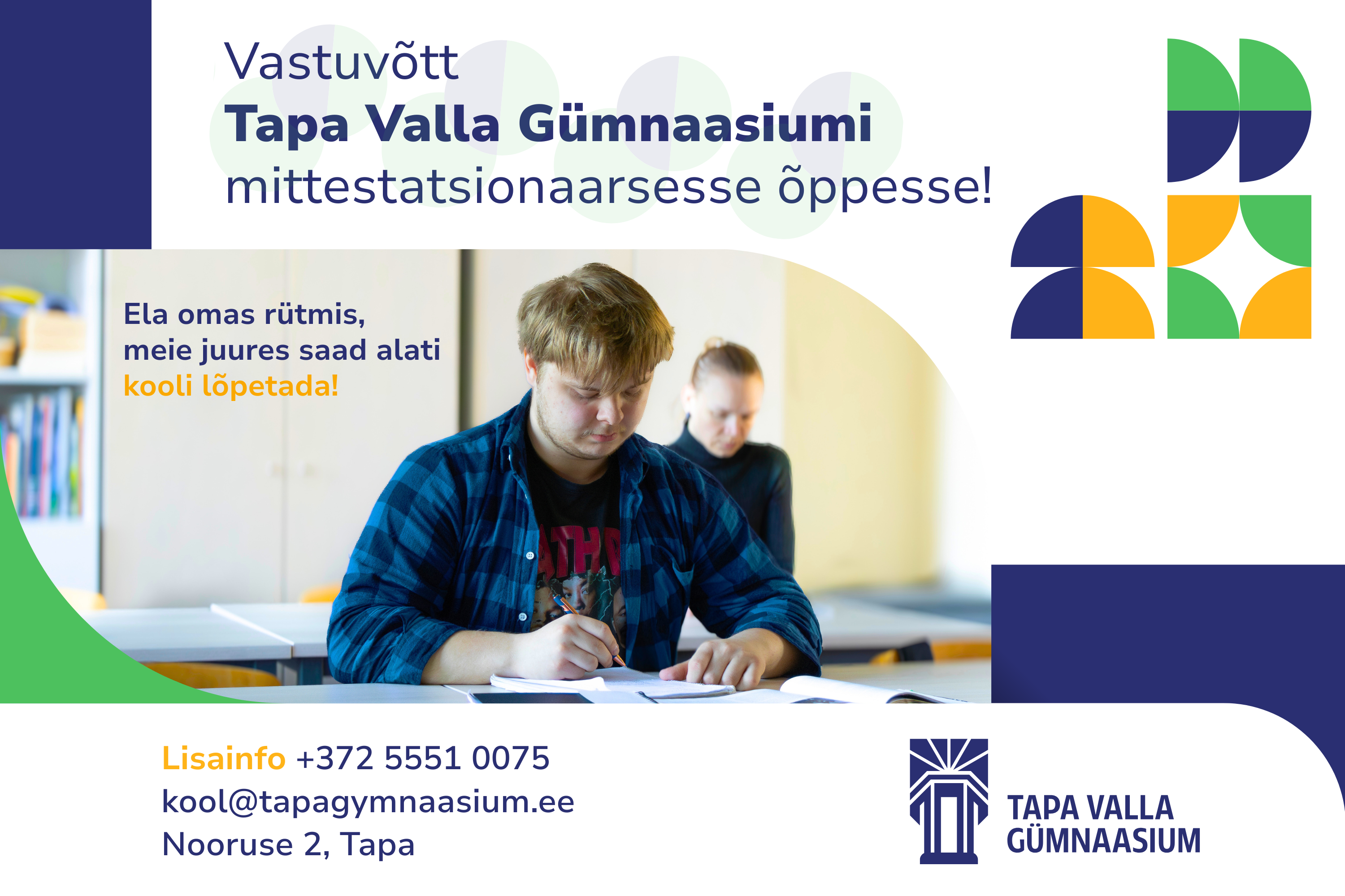 Enne vastuvõttu toimub vestlus mittestatsionaarse õppe õppejuhiga Tapa Valla Gümnaasiumis (Nooruse 2, Tapa).
