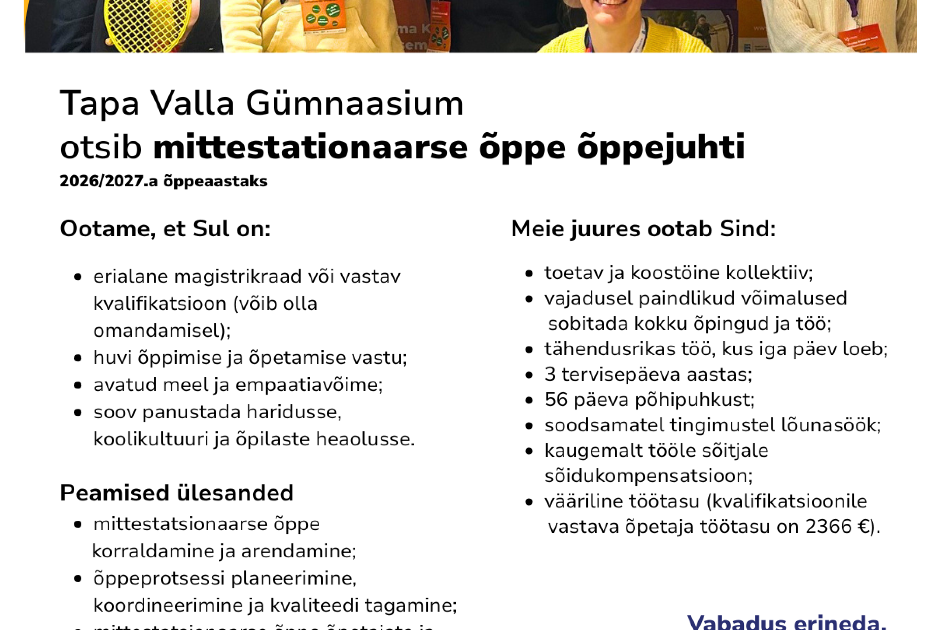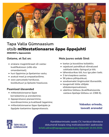 Tapa Valla Gümnaasium otsib mittestatsionaarse õppe õppejuhti