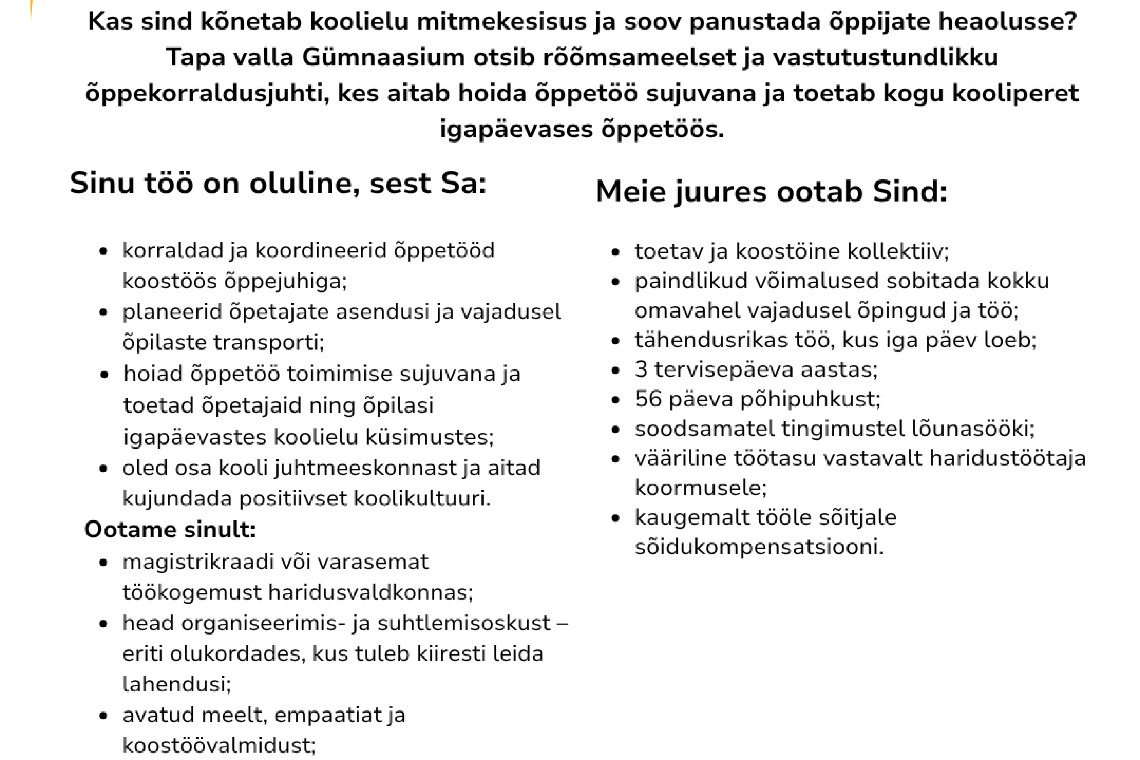 - oled osa kooli juhtmeeskonnast ja aitad kujundada positiivset koolikultuuri.