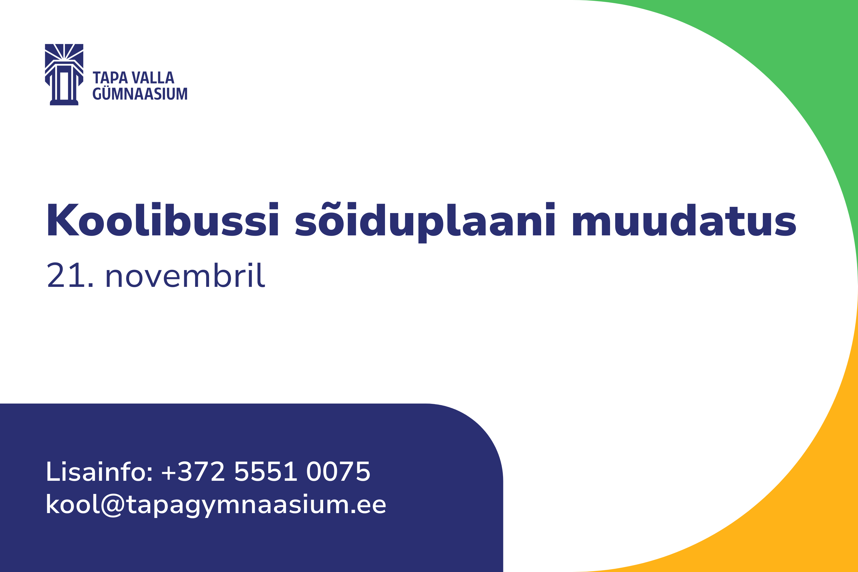 Tapa Valla Gümnaasiumis toimub 21. novembril tavaline koolipäev, 7.–12. klassidel on kõik tunnid nii, nagu tunniplaani märgitud. Kuna koolibussid liiguvad koostöös Tapa Valla Kooliga ja seal on 1.–6. klassidel iseõppepäev, siis nimetatud bussireis jääb sel päeval ära.