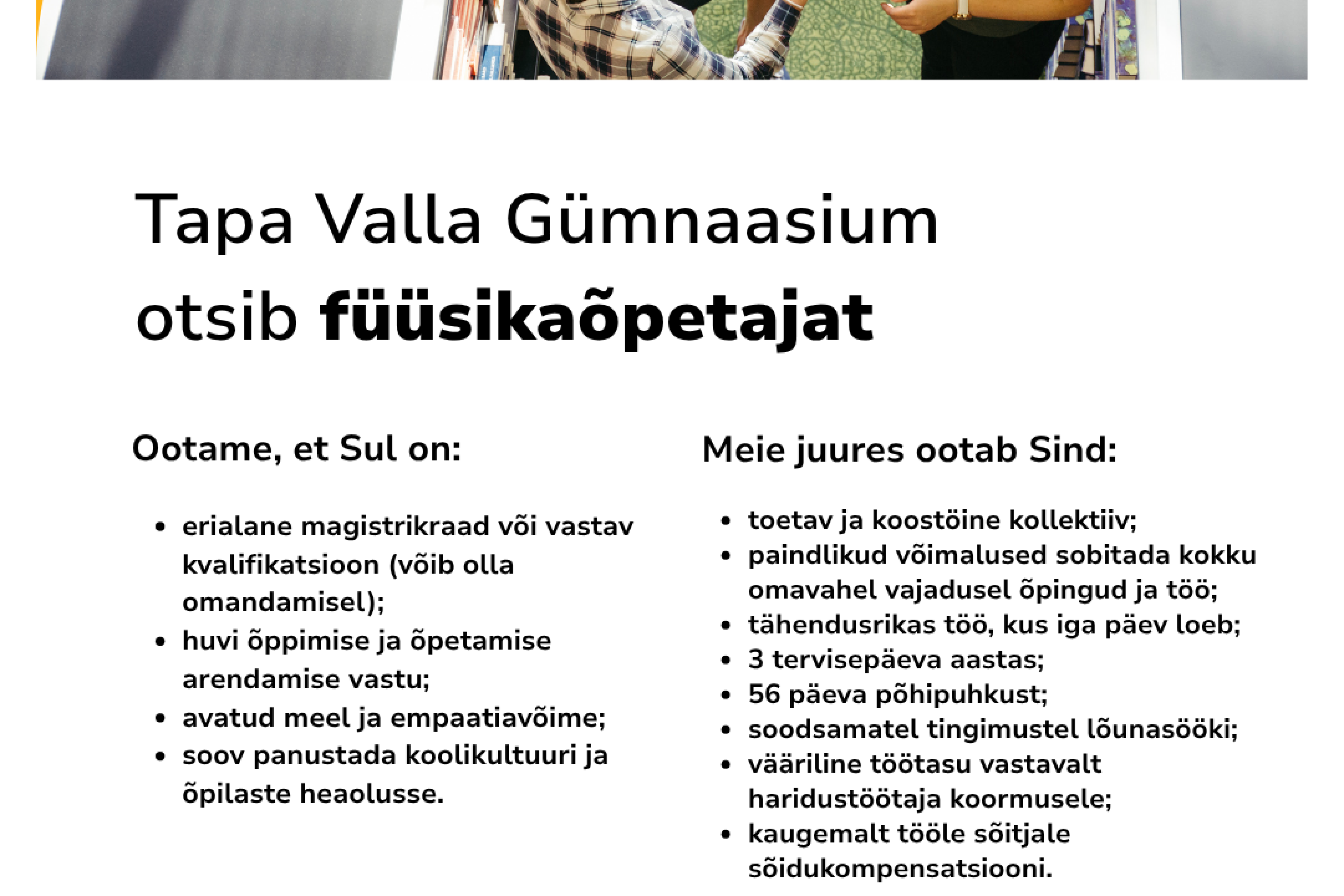 Tapa Valla Gümnaasium pakub õpilastele kihvti võimalust valida sise- ja riigikaitse suuna ja mitmekülgse moodulõppe vahel, mis sisaldab atraktiivseid valikaineid. Tihti toimuvad koolis ägedad üritused, mida korraldab aktiivne õpilasesindus ja kooliraadio "Sõlm". Õpetajad leiavad eest avatud ja innovaatilise juhtkonna, kelle sihiks on muutused ja areng. Meie koolis on ruumi kasvamiseks ja võimalusi õppesuundade väljaarendamiseks.